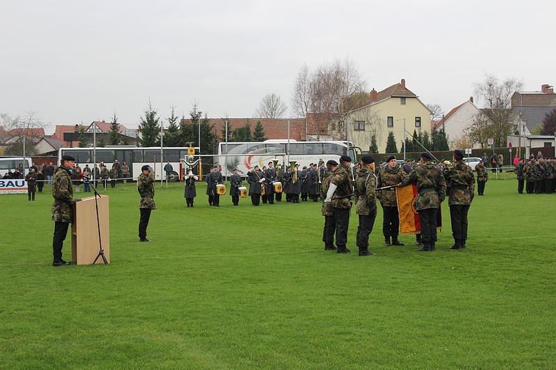 Mit dem Einmarsch der Einheiten, angeführt von Kompaniechef Major Marcel Wünsch und dem Einmarsch der Truppenfahne begann der öffentliche Appell. Für den feierlichen Rahmen sorgte das Musikkorps des Wehrbereichskommandos III unter der Leitung von Hauptmann Thomas Schmidt-Peter.
