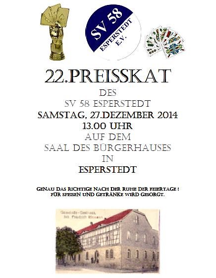 Am Samstag, den 27.Dezember 2014 findet ab 13.00 Uhr der auf dem Saal des Bürgerhauses in Esperstedt ein Preisskat statt.