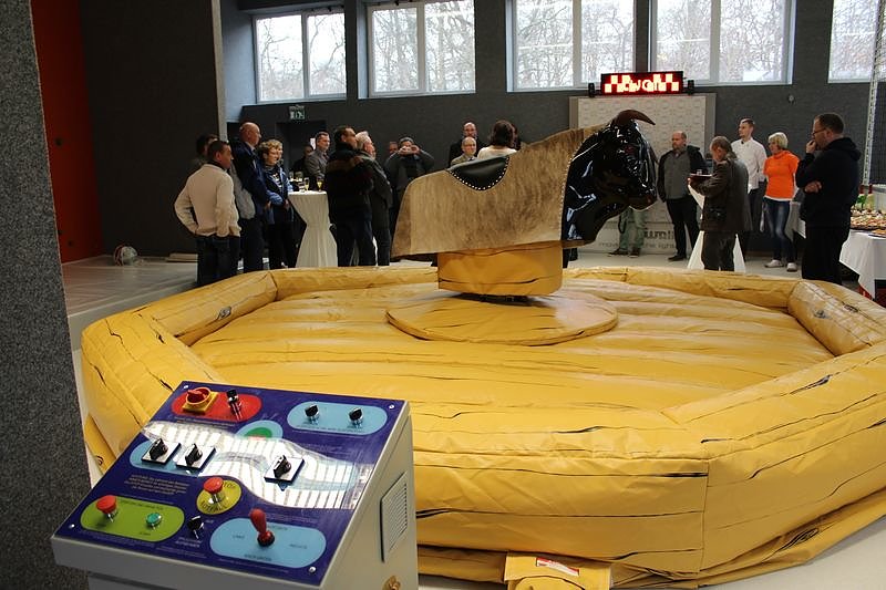 Und so ließ es sich Norbert Enke nicht nehmen selbst das Bull-Riding auszuprobieren. Sehr zur Freude der Gäste, Mitarbeiter, Vertreter von Baufirmen und Projektanten zeigte der Bulle, dass man nicht ewig auf so einem Ding sitzen kann