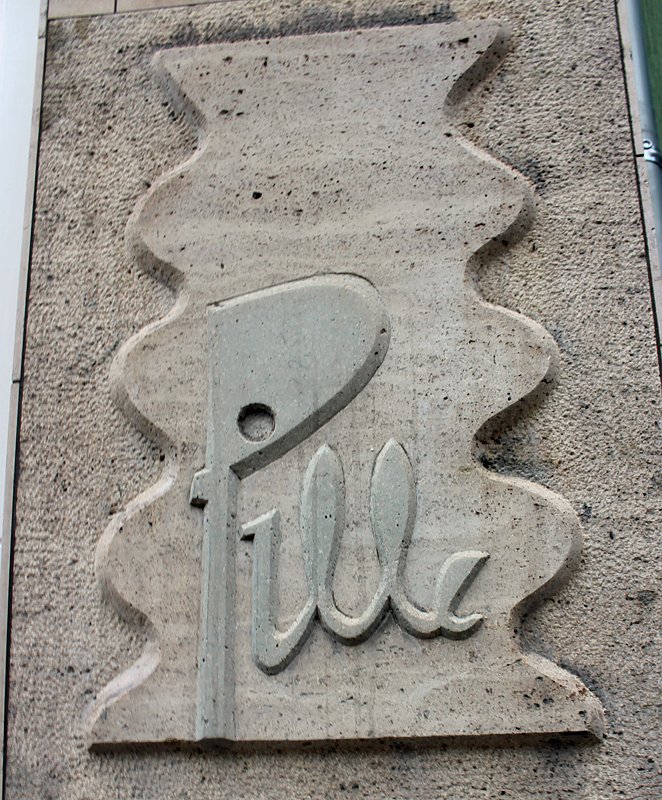 Vom Gerüst mehr oder weniger verdeckt weist dieser Stein in der Fassade darauf hin, was sich hier mal befand, das Café Pille.