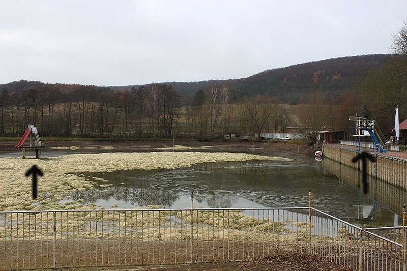 Die Bebra liefert zur zeit wenig Wasser. Man sieht es, an dem nur spärlich sprudelndem Wasser. Und den kleinen Bebraer Teich wollte man nicht mit einem Ruck leerlaufen lassen, nur um den großen Teich zu füllen. Allerdings wird es jetzt kritisch ob das Wasser für das Weihnachtstauchen reicht.