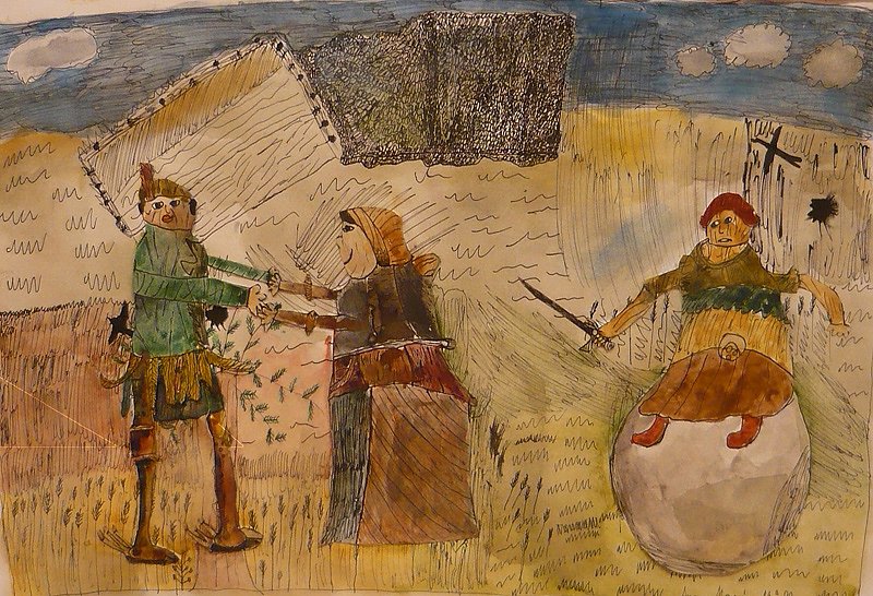 Zu sehen sind hier mehrere Werkgruppen. Im Herbst 2013 beschäftigten sich die Kursteilnehmer mit Landschaftsdarstellungen und nach ausgiebigen Studien in der freien Natur nahe dem Panorama-Gebäude entstanden in der Werkstatt mit Feder und Tusche ausgeführte Zeichnungen. Einige Kinder versuchten zusätzlich eine weitere Darstellung ihres Motivs mit der Rohrfeder. Bemerkenswert im Nebeneinander dieser Landschaften ist vor allem, welch unterschiedliche Varianten eines einzelnen Motives hier gefunden wurden. In einem nächsten Schritt wurden diese Landschaften aquarelliert und zum Tummelplatz von Figuren aus dem Panoramagemälde umfunktioniert. Also ganz in Analogie von Werner Tübkes Arbeitsweise, der einmal in einem Interview äußerte, dass seine Landschaftsstudien vor allem die glaubhafte Kulisse für sein komisches Personal seien.