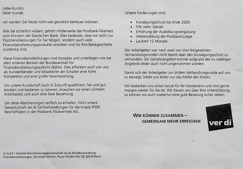 Und in der Tat, bei der Postfiliale hing ein Schreiben in dem die Gewerkschaft ver.di ankündigt, dass heute gestreikt wird.