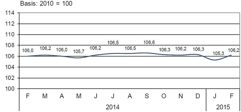 Der Verbaucherpreisindex für Thüringen 2014/15Die Inflationsrate lag nach Mitteilung des Thüringer Landesamtes für Statistik im Februar 2015 um 0,2 Prozent über dem Vorjahresniveau. Gegenüber dem Vormonat Januar stiegen die Preise im Durchschnitt um 0,9 Prozent. Sie erreichten einen Indexstand von 106,2 Prozent (Basis 2010=100).