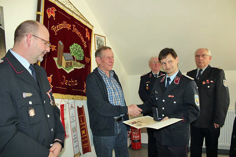 Anschließend nahm Mario Hasenbein zwei Auszeichnungen vor. Heinz Ludwig erhielt die Ehrenmedaille des Kreisfeuerwehrverbandes. Ludwig ist bereits seit 1958 bei der Freiwilligen Feuerwehr.