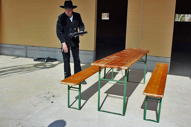Gert Huke von der bauausführenden Zimmerei übernahm die wichtige Funktion des Richtspruches. Und damit der Bau auch gelinge gab es einen "Klaren" und traditionell zerschellte das Glas auf dem Boden.
