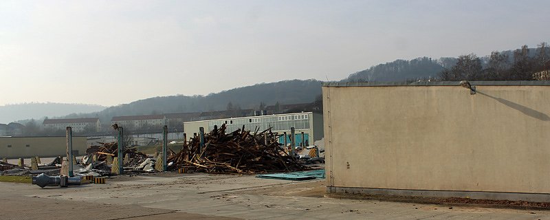 Erster Informationspunkt war die Bundeswehr. Dort hat, aus Sicht der Jacherstraße gezeigt, hat der der Abriss der alten Hallen begonnen. Hier wird die Bundeswehr eine Sportstätte für die Ausbildung bauen.