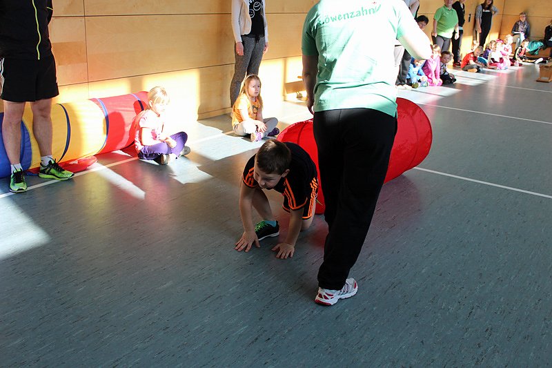Auf neun Stationen waren Bewegungsspiele der verschiedensten Arten angesetzt, ob balancieren, hüpfen, Ski laufen oder kriechen durch den Tunnel, wie hier im Bild. Auch gesundes Obst wurde angeboten.