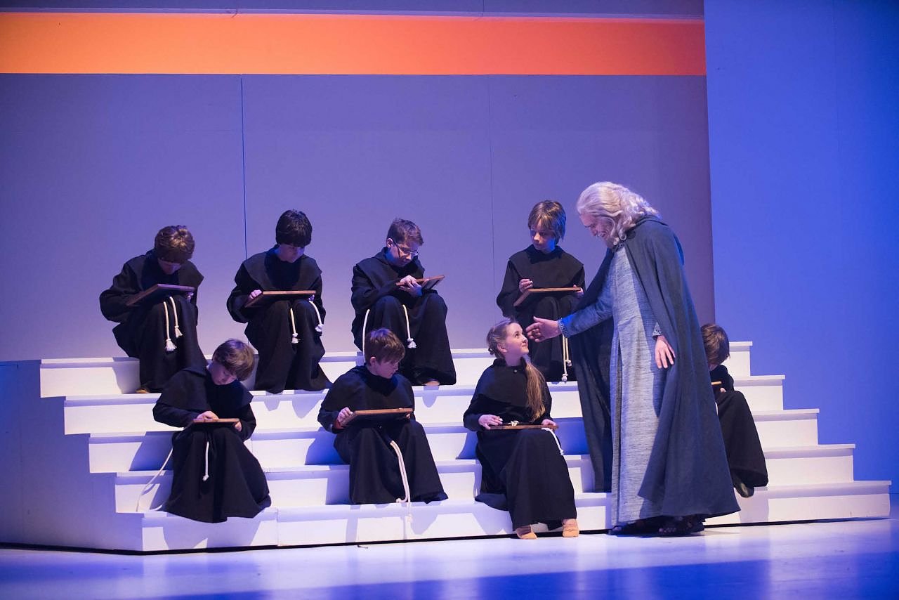 Die kleine Johanna (Zoé von Soden) lernt in der Klosterschule Dorstadt von ihrem Lehrmeister Aeskulapius (Thomas Kohl) das Kirchen-Einmaleins