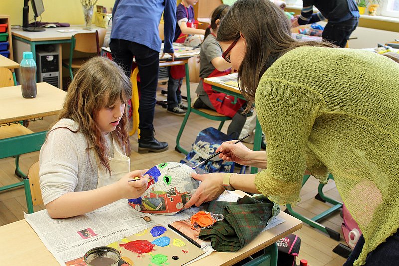 Es ist bereits der 3. Tag der Vorbereitung in der Schule. In den verschiedenen vier Klassen der Schule werden Masken gemalt, hier zum Beispiel der Vögel in der 2. Klasse.