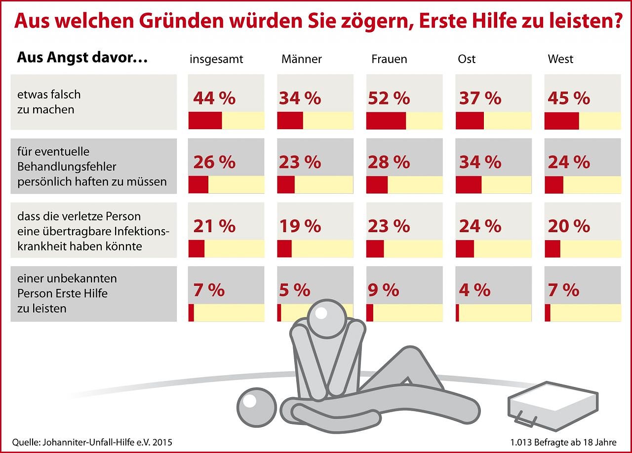 Auf die Frage, warum Menschen Verletzten nicht helfen, antworteten 44 Prozent der Forsa-Befragten: aus Angst, etwas falsch zu machen. Nur wer gar nichts tut, handelt falsch. Wir konzentrieren uns in den Erste-Hilfe-Kursen auf das Wesentliche. Mit vielen praktischen Übungen lassen sich die Handgriffe im Ernstfall leicht anwenden, erklärt Thomas Heimann, der bei den Johannitern in Nordhausen für die Erste-Hilfe-Ausbildung zuständig ist.
