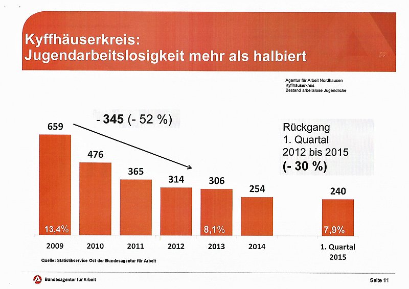 Über die aktuellen Eckdaten der Arbeitsagentur, die Arbeitslosigkeit im Kyffhäuserkreis beträgt aktell nur noch 11,8 Prozent (so niedrig wie noch nie), hatte kn bereits berichtet (ARBEITSLOSIGKEIT GEHT ERNEUT ZURÜCK). Froböse verwies aber besonders auf die gute Entwicklung bei den Jugendlichen: