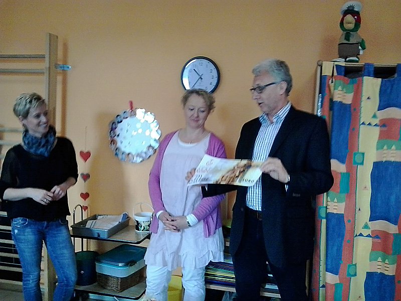 der Evangelischen Kirche in Mitteldeutschland und Mitglied des Vorstands der Stiftung Senfkorn an Grit Szemendera, Leiterin der Kindertagesstätte im Beisein von Marita Leyh, Referentin für Kindertagesstätten der Diakonie Mitteldeutschland und stellvertretende Vorsitzende des Vorstands der Stiftung Senfkorn.