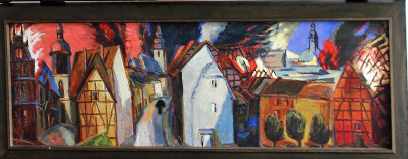 Autor: khhIn der Kirche, im ehemaligen Jugendzimmer befindet sich das Bild "In Memoriam 1945" des Sondershäuser Künstlers Prof. Ronald Paris, der als 12-Jähriger die Bombardierung miterlebt hatte und seine Eindrücke später selbst künstlerisch verarbeitet hat.