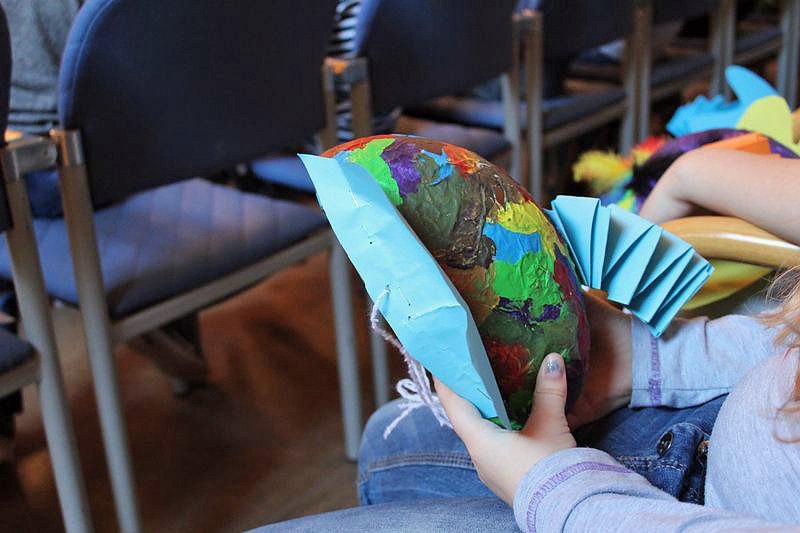Frank stellte nicht nur den Komponisten vor, sehr einfühlsam wie er darstellte, diesen komplizierten Namen auszusprechen, sondern stellte auch vor, welche Instrumente in welcher Spielweise verwendet hat, um später im Konzert die Tiere erkennen zu können. Die Kinder der Kollwitz-Schule sich mit den entsprechenden selbstgefertigten Tiermasken.