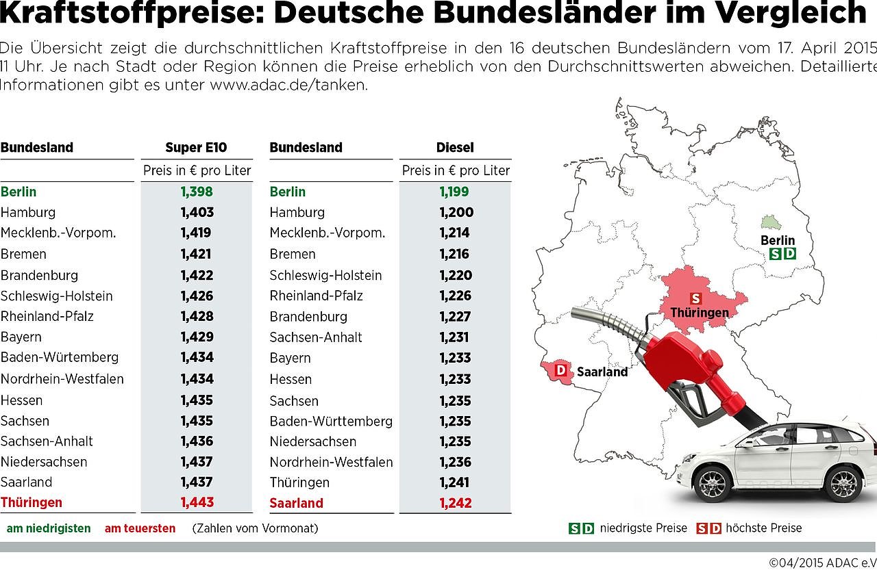 Diesel ist im Saarland (1,242 Euro) und in Thüringen (1,241 Euro) am teuersten. In der aktuellen Untersuchung hat der ADAC am heutigen Freitag um 11 Uhr die Preisdaten aller rund 14 000 bei der Markttransparenzstelle erfassten Tankstellen ausgewertet und den Bundesländern zugeordnet.