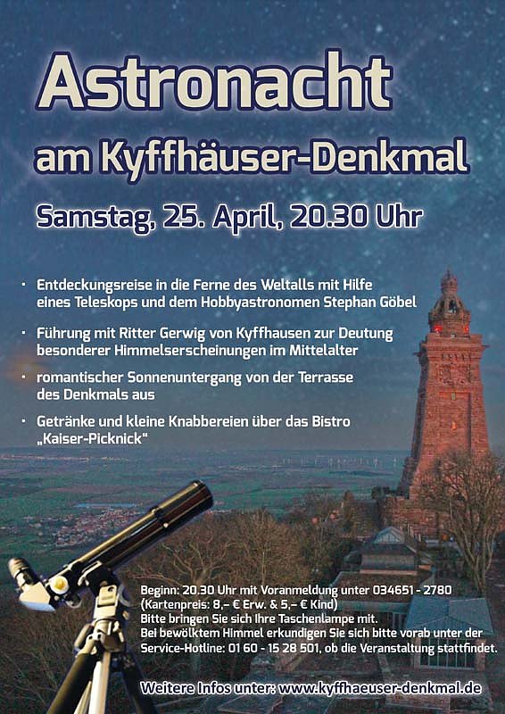 Am 25.04.2015 lädt die Kur & Tourismus GmbH Bad Frankenhausen ab 20.30 Uhr zur ersten Astro-Nacht am Kyffhäuser-Denkmal ein. Treffpunkt ist das Kassenhäuschen oben am Kyffhäuser-Denkmal.
