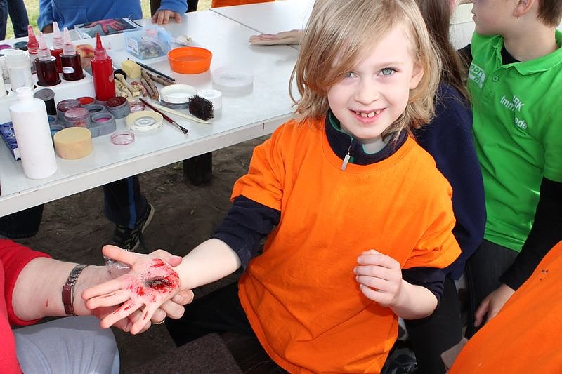 Immer wieder spannend das Schminken. Und es sieht tatsächlich verblüffend echt aus. Gleich daneben wurde das Betreuen von Verletzten geübt.