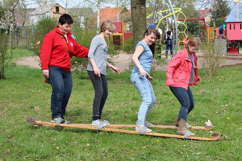 Aber nicht nur reine Ausbildung gab es. Auf dem Festplatz neben dem Sportplatz von Berka waren Stationen mit Spiel und Spaß. Was auf dem Foto so einfach aussieht, zeigte sich im Video als sehr spannende, aber auch Spaß bereitende Teamarbeit.