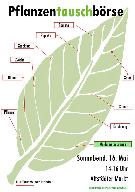 Handel ist jedoch ausgeschlossen. Nebenbei werden Erfahrungen, Fragen, Tipps und saisonale Waldmeisterbrause verteilt. (Rückfragen über gruenzeug@kyf.net)