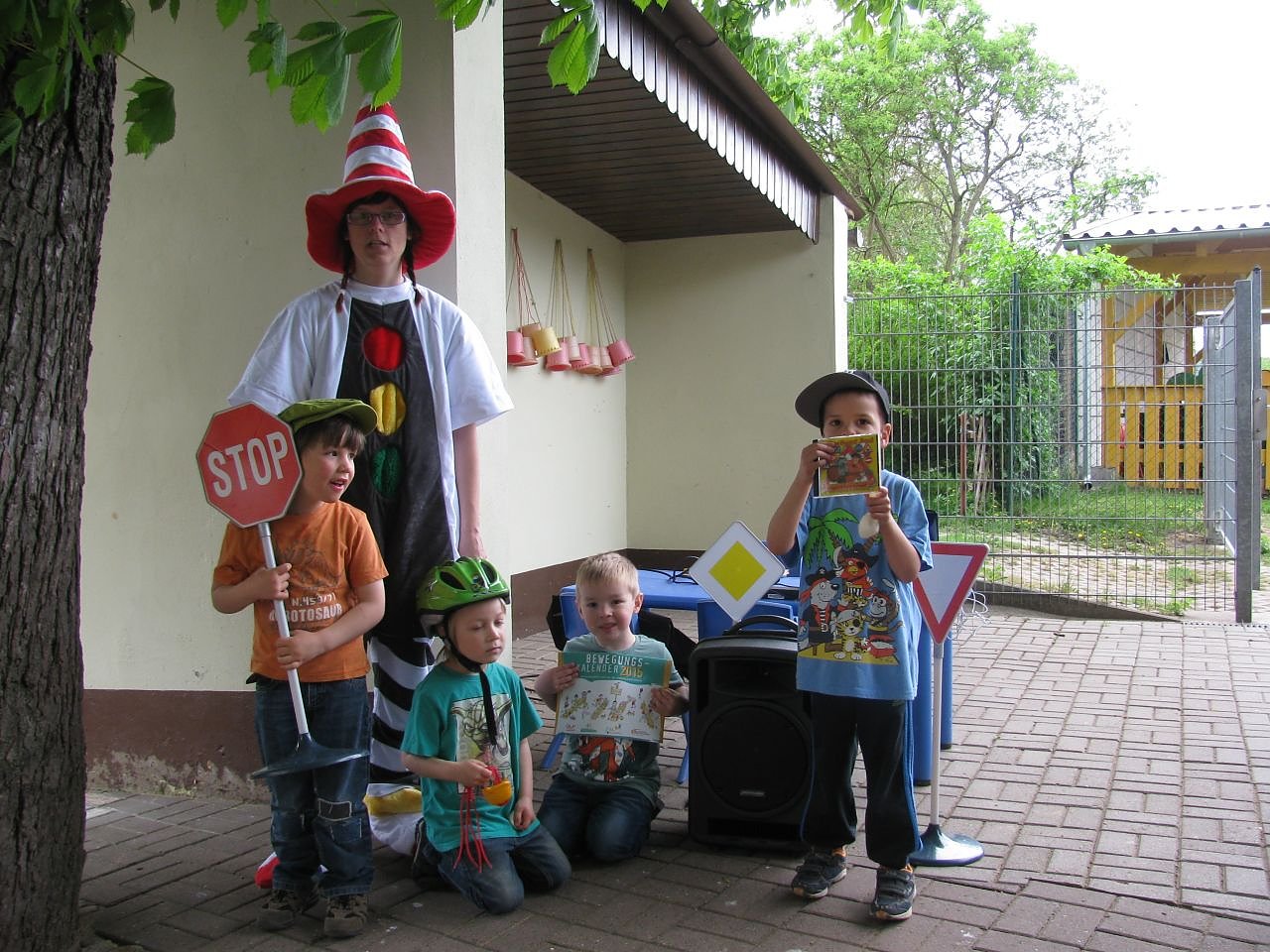 Leider spielte das Wetter nicht so richtig mit, es kam Regen, und in den letzten 30 min. mussten wir in die Innenräume der Kita ausweichen. Zur Verdeutlichung der Thematik wurde den Kindern ein Verkehrsaufklärungsfilm zum richtigen Verhalten im Straßenverkehr gezeigt.