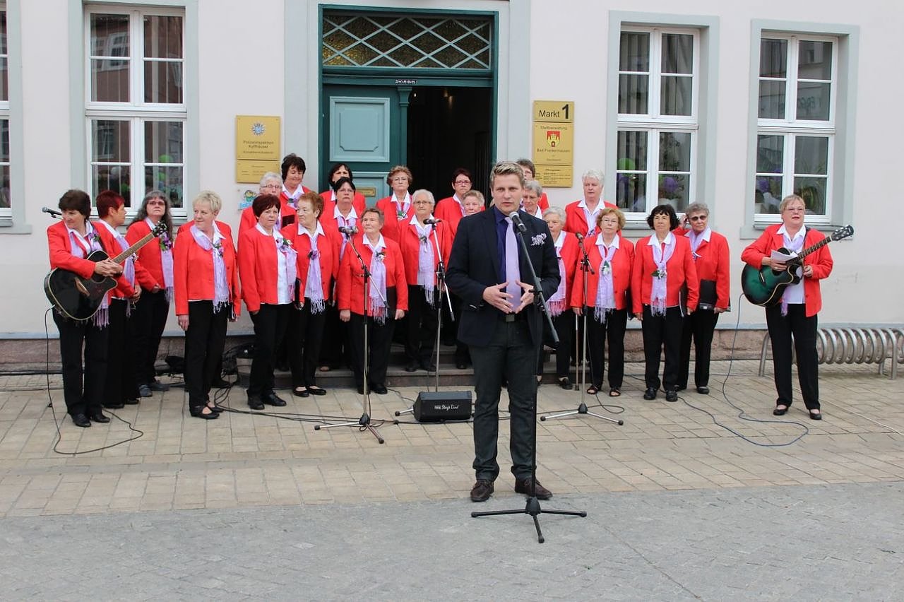 Die Eröffnung des 23. Fliederfestes nahmen der Bürgermeister Matthias Strejc und in diesem Jahr der amtierende Vorsitzende des Gewerbevereins Bad Frankenhausen vor. Musikalisch unterstützt wurden beide vom Frankenhäuser Frauenchor und dem Frankenhäuser Fanfarenchors.