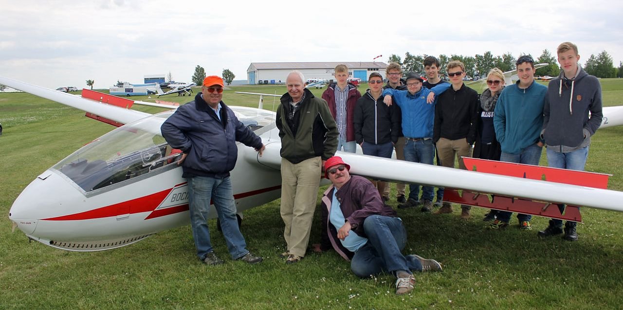 Ab Freitag standen dann pünktlich um 9 Uhr die Segelfluganwärter zu ihrem ersten Schnupperkurs auf dem Flugplatz. Auch hier gab es eine gute Mischung aus Theorie und Praxis. Die jungen Leute, unter ihnen ein Mädchen, erfuhren, warum ein Flugzeug überhaupt fliegt, wie ein Segelflugzeug zu steuern ist, wie man sich auf dem Flugplatz verhalten muss und vieles mehr. Quasi zur Eröffnung des Fliegerlagers konnte ein junger Pilot, der seine Fliegerkarriere ebenfalls mit einem Schnupperkurs begann, seine ersten Alleinflüge im Bocian erleben. Dieser Moment, den wohl kein Flieger je vergessen wird, war nun endlich auch für Benedikt Funk gekommen. Er meisterte seinen ersten Alleinflug mit Bravour und gab so ein anschauliches Beispiel für die neuen Schnupperkursteilnehmer. Für die waren die 4 Segelflugstarts, bei denen die sieben Segelflugeleven dann echtes Gliding-feelling spüren konnten, das absolute Highlight. Interessant war dabei besonders, dass einige der jungen Leute Mitglied eines Hobbyfilmclubs sind und natürlich alles gut dokumentiert haben.