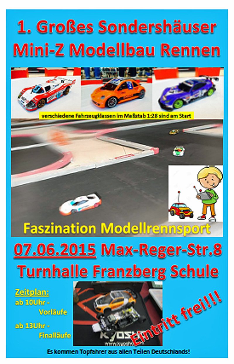 Am 07.06.2015 findet das 1. Sondershäuser Mini-Z Modellbau Rennen statt. Ab 10:00 Uhr geht es in der Turnhalle der Franzbergschule los.