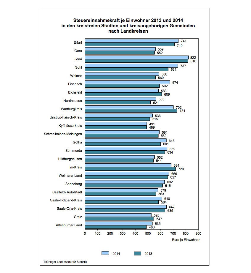 Steuereinnahmekraft je Einwohner 2013 und 2014 in den kreisfreien Städten und kreisangehörigen Gemeinden nach Landkreisen (Foto: Thüringer Landesamt für Statistik)