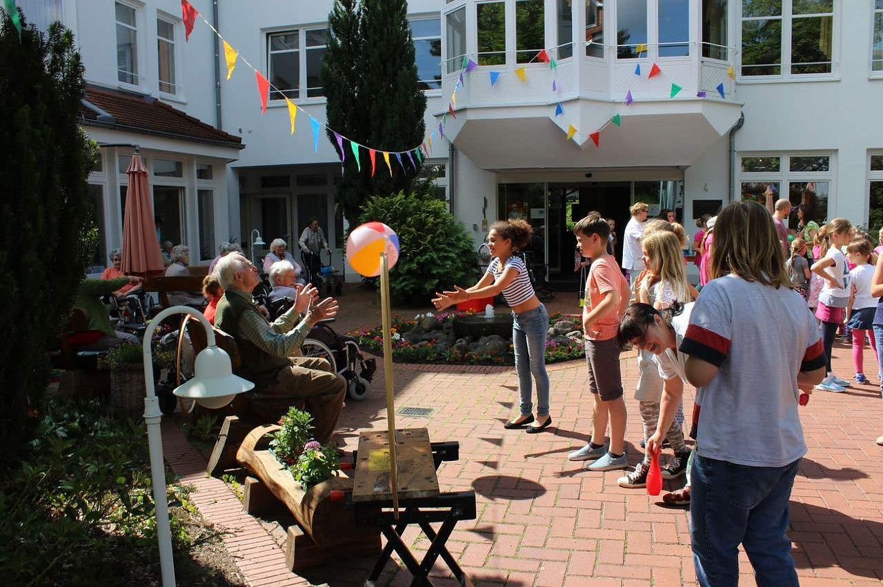 Und so wurden dann später vor dem Haus Spiele organisiert. Und wer nicht mehr gut zu Fuß war wurde eben im Sitzen beim Spiel mit dem Ball einbezogen.