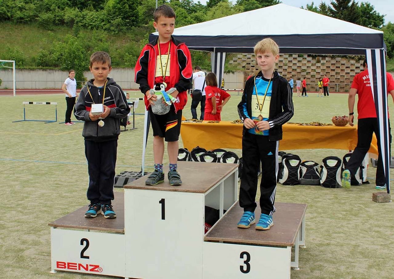 Hier die ersten Siegerehrungen vom heutigen Tag. In der Altersklasse M7 Weitsprung gewann Devin Barnabsch (Rot-Weiß Wiehe) mit 2,77 m vor Simon Minalga (SV Glückauf Sondershausen) und Konstantin Bahlke (SV Glückauf Bleicherode).