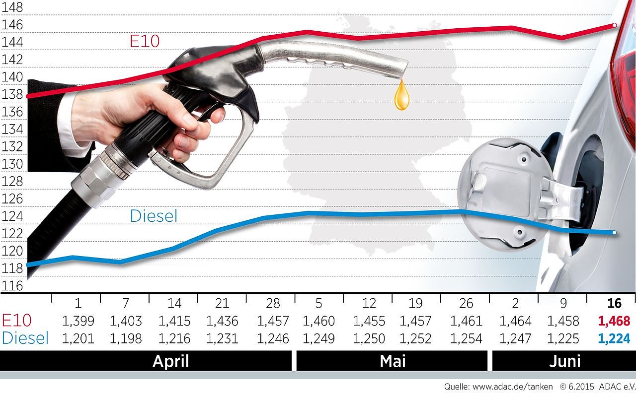 Nach Angaben des ADAC hat sich der Preis im Vergleich zur Vorwoche für einen Liter E10 um einen Cent erhöht und liegt nun bei 1,468 Euro. Diesel ist hingegen mit 0,1 Cent nur leicht gesunken und kostet derzeit an den Zapfsäulen 1,224 Euro....