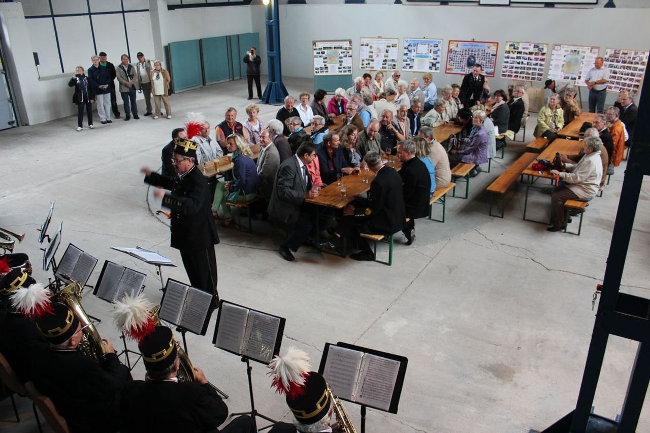 Autor: khhZuerst allerdings ging es im Regen los. Die Kranzniederlegung am Gedenkstein (Schachtstraße am Technischen Denkmal) um 10:00 Uhr statt. Danach begab sich der Tross in Richtung Petersenschacht, auch vielen noch als Schacht II bekannt. Hier auf dem Gelände hinter der GVV findet seit Jahren traditionell der Bergmannsfamilientag statt.