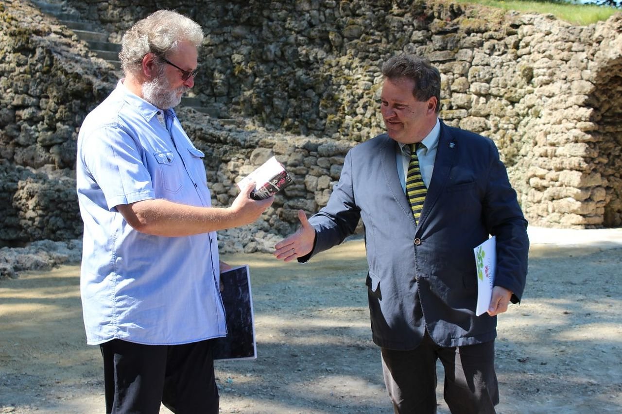Architekt Dr.Ing. Folke Dietzsch und Lothar Menzel vom Förderverein bedankten sich bei den Sponsoren und wurde von kn mal vor dem Highlight des Schlossparks positioniert, ode dem kleinen Bruder des Herkules von Kassel. Übrigens sind in den letzten 25 Jahren rund 2,4 Millionen Euro in die Sanierung des Schlossparks geflossen, wie Bürgermeister Uwe Vogt informierte. Für den 12. Bauabschnitt werden keine Gelder der Stadt Ebeleben eingesetzt. Die Mittel sollen alle aus Spenden von Sponsoren und von Fördermitteln kommen.