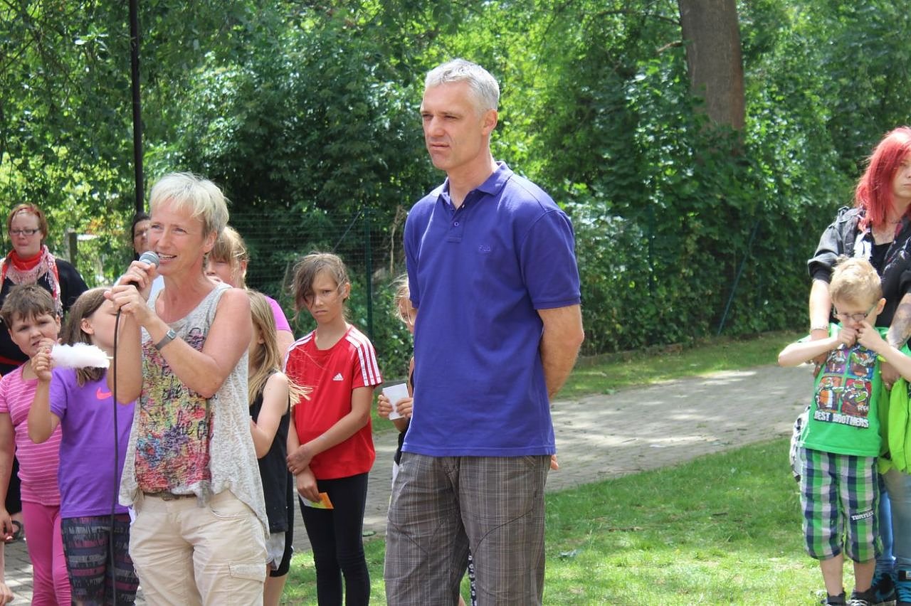 Im Vorfeld hatten wir mit den Kindern über die Wichtigkeit von gutem Wasser für das Leben gesprochen, so Schulleiterin Ellen Neumann, hier mit Sportlehrer Uwe Hasselbach, bei der Begrüßung der Eltern Freunde und vieler Sponsoren, die sich die Läufe nicht entgehen lassen wollten.