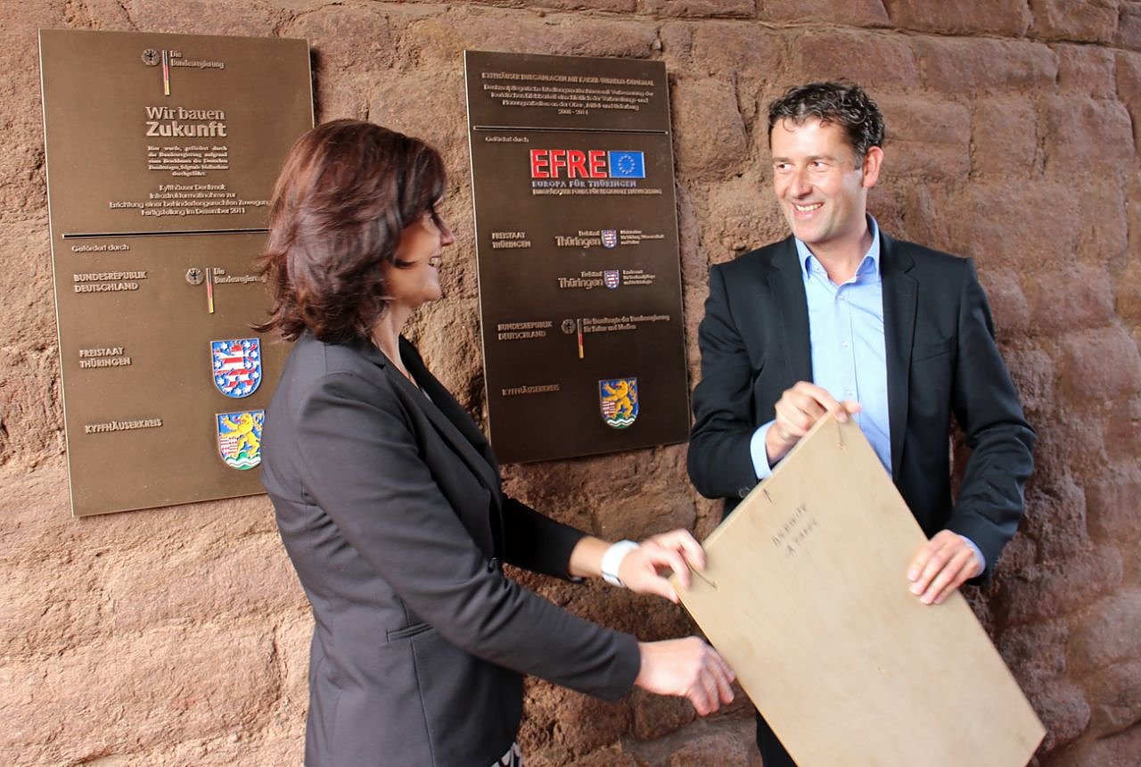 Nach der Übergabe und der Enthüllung von zwei Informationstafeln, wer eigentlich die Hauptgeldgeber für die Arbeiten am Kyffhäuserdenkmal waren, zog der ganze Tross, an Planer, Bauleuten und Politikern, samt Medienvertreter zur Unterburg am Kyffhäuser.