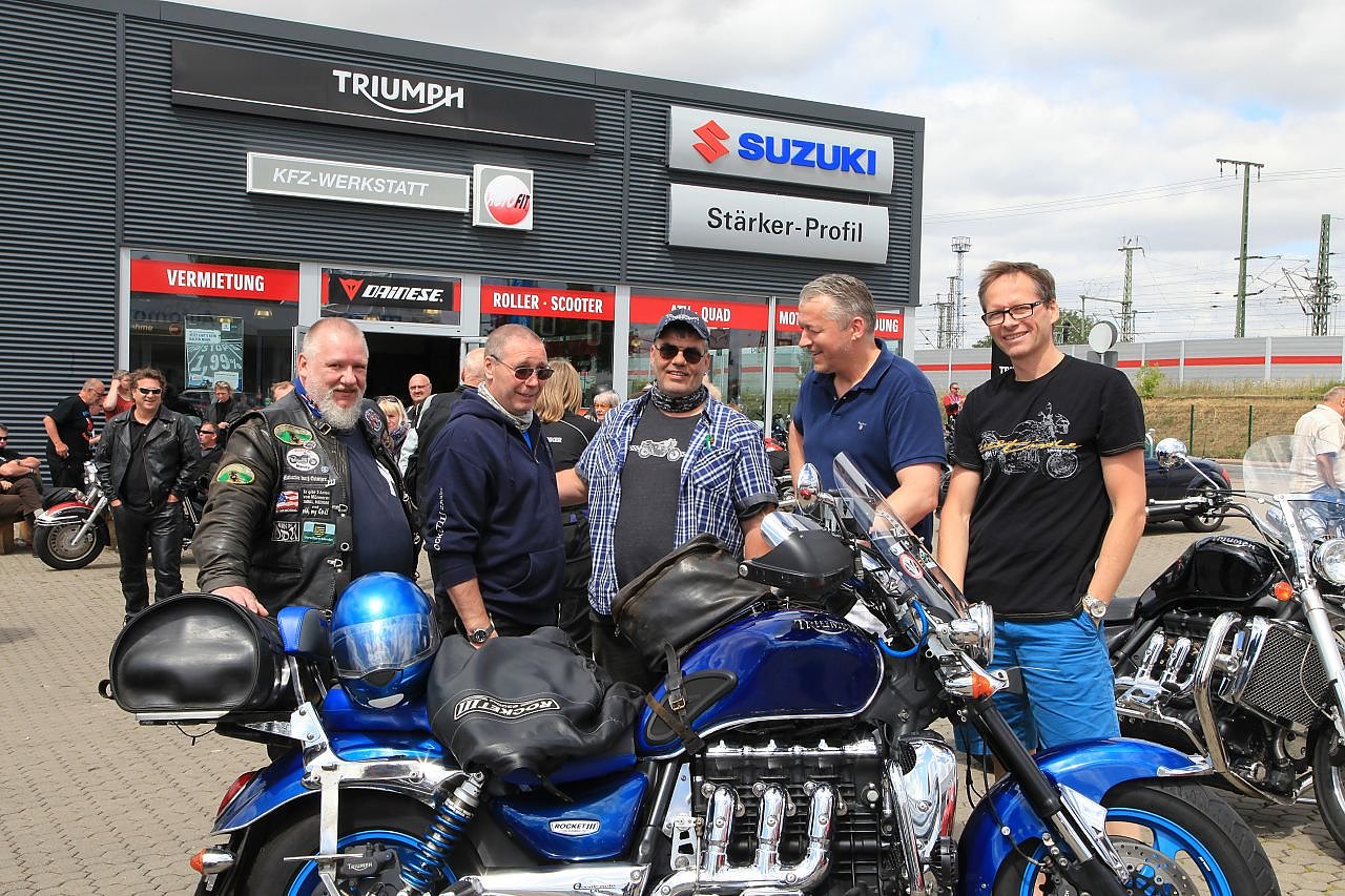 Am Freitag Mittag wurden die Rocket’s bei der Triumph World in Erfurt erwartet. Die Brüder und Geschäftsführer Matthias & Michael Andrzejak hielten für das leibliche Wohl der Big Biker Softgetränke und original Thüringer Rostbratwürste bereit und räumten den Triumph Enthusiasten einen Sonderrabatt für begehrte Triumphartikel und Zubehör ein. Auch die Spezialisten der Triumph World Erfurt hat dieses Highlight schwer beeindruckt.