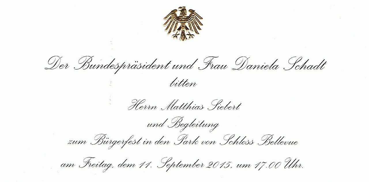 Jetzt erhielt der Tüftler und Bastler eine Einladung. Aus dem Schloss Bellevue an der Spree in Berlin kam sie. Darin steht: Der Bundespräsident und Frau Daniela Schadt bitten Herrn Matthias Siebert und Begleitung zum Bürgerfest in den Park von Schloss Bellevue am Freitag, dem 11. September 2015, um 17 Uhr.