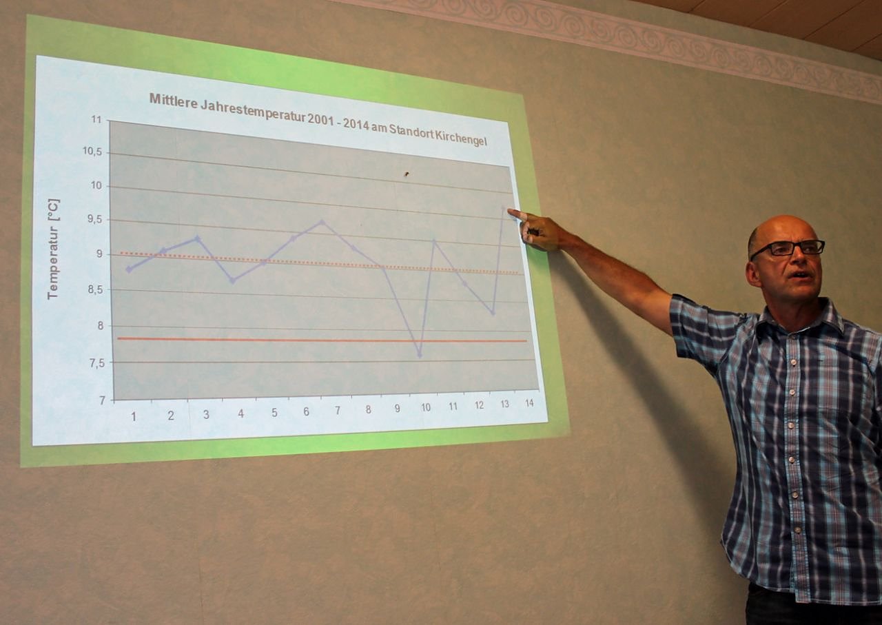Dr. Uwe Rößler von der Versuchsstation Kirchengel gab einen Überblick über die Klimasituation. Mit Grafiken zeigte er nicht nur den überdurchschnittlichen Anstieg der Durchschnittstemperaturen in den letzten 10 Jahren.