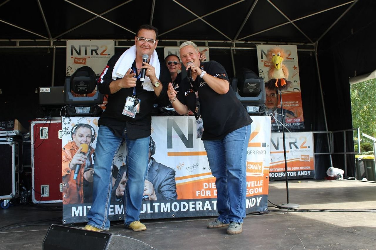 NTR2 ist live on Tour und Andreas Siegmund, mehr unter dem Namen Kultmoderator Andy, und Susi Platte, hier rahmen sie gerade Hytte ein, sorgen jetzt schon für Stimmung. Ab 18:00 Uhr geht dann die Party für die Großen los.