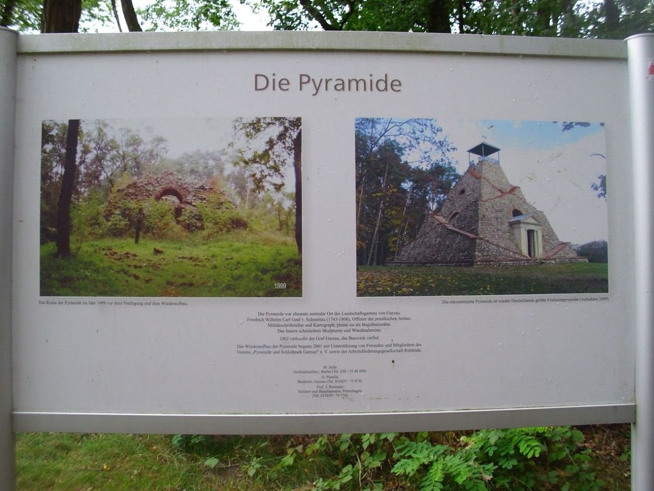 Würden Sie bei Berlin mitten im Wald eine Pyramide vermuten? Wir bisher auch nicht und Ägypten ist sehr weit weg. In Garzau, einem kleinen Ort mit ehemaligem Grafensitz gab und gibt es sie in einer Landschaftsgartenanlage des Friedrich Wilhelm Carl Graf zu Schmettau (1743 – 1806). Hier war sie als zentraler Punkt des Landschaftsgartens angelegt worden. Leider ist vieles von diesem Landschaftsgarten so nicht mehr erhalten geblieben. Aber die Pyramide, ursprünglich auch als besondere Begräbnisstätte errichtet, steht genau hier. Aus der Bestattung in dieser Pyramide wurde nichts, das Bauwerk verfiel zwischenzeitlich und wurde ab 2001 durch den Verein Pyramide und Schlosspark Garzau e. V. wieder aufgebaut. Am Hang vor der Pyramide wurden zwischenzeitlich auch wieder Rebstöcke (Wein) angepflanzt.