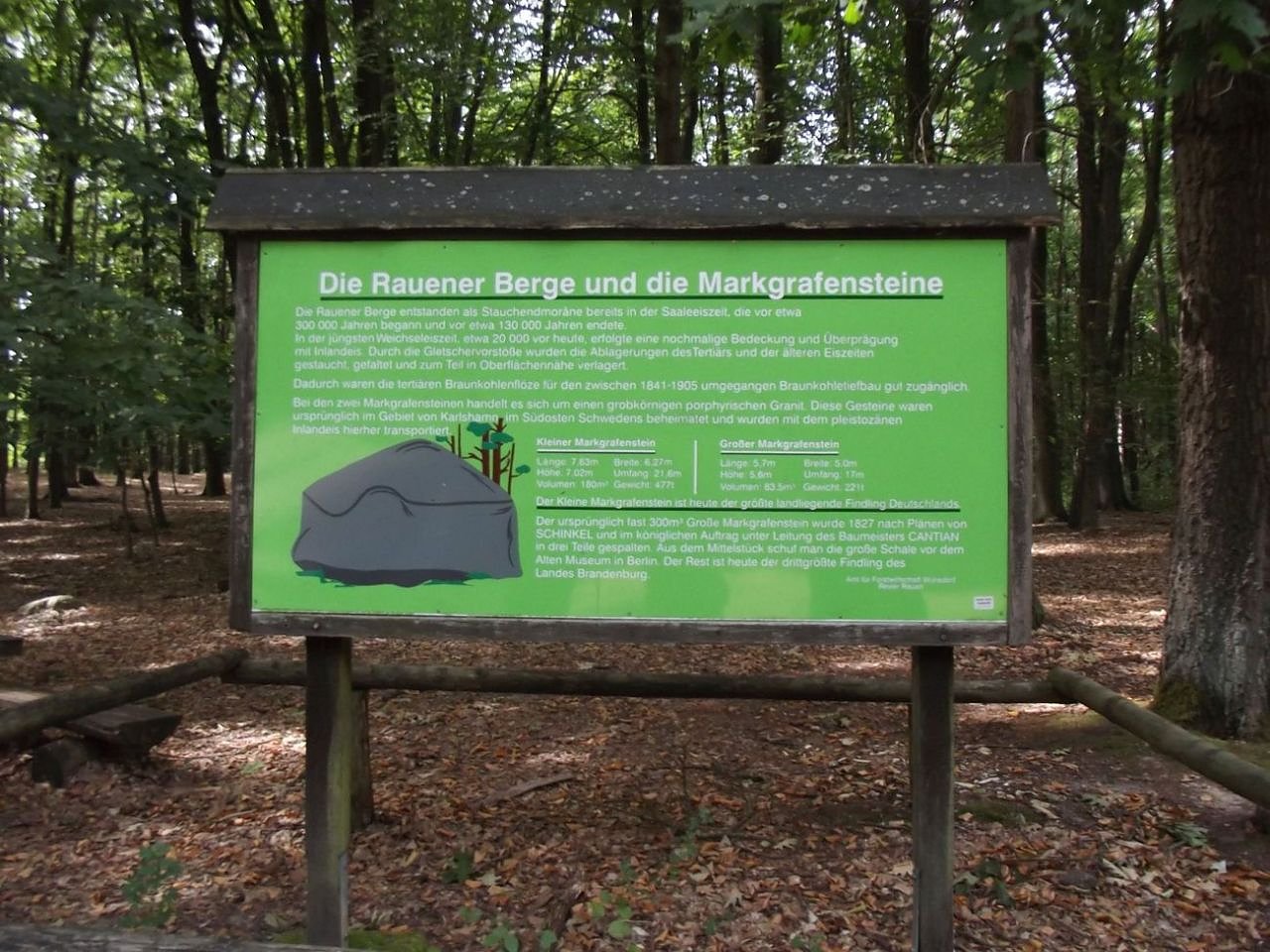 Auf unserer nächsten Entdeckungstour verschlug es uns in die Gegend der Rauener Berge. Hier führt auch eine Autobahn entlang und man kann in der Nähe einer solchen Autobahnbrücke auf einem kleinen Parkplatz parken. Weiter geht es zu Fuß durch den Wald, was bei erwarteten Temperaturen bis etwa 30°C sehr angenehm war. Zuerst wandern wir zu den zwei Markgrafensteinen. Diese wurden während der Eiszeit aus Südschweden hierher mit den Eismassen verschoben. Der kleine Markgrafenstein ist der größte landliegende Findling Deutschlands.