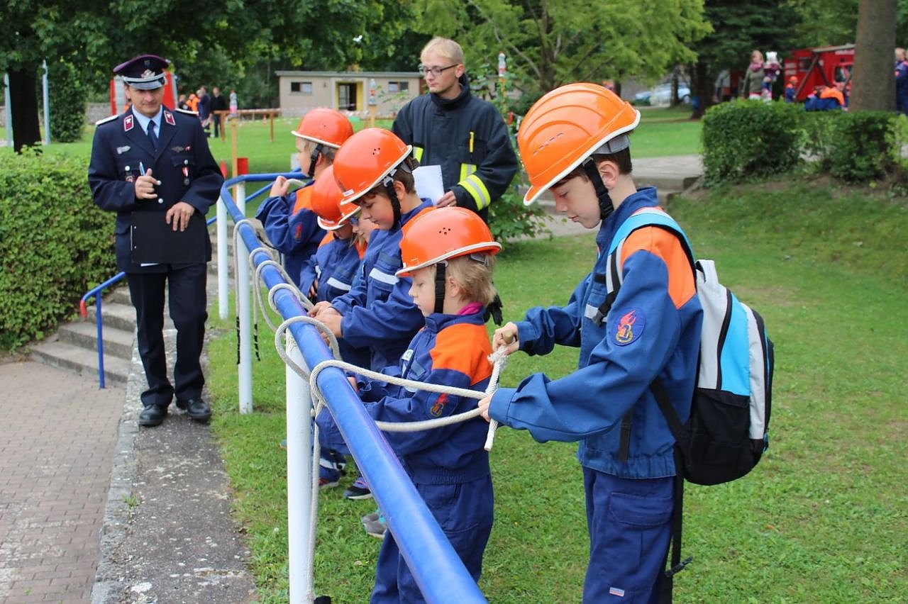 Hier meistern gerade die jungen Feuerwehrleute Knoten zu binden. Als Gruppe müssen sie mindestens zwei verschiedene Knoten ordnungsgemäß nach weisen. Hier die junge Gruppe der Feuerwehr Bebra beim Knoten binden.