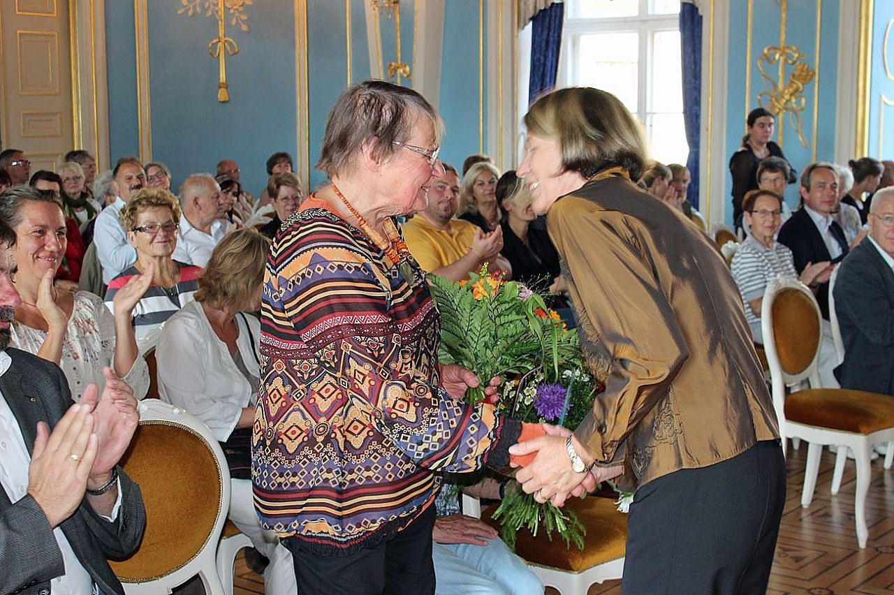 Mit einem Blumenstrauß bedankte sich Museumsdirektorin Christa Hirschler bei der Witwe von Günter Jahn, Gudrun Jahn, nicht nur weil diese Ausstellung ermöglicht wurde, sondern weil vor knapp einem Jahr (21.10.2014) Gudrun Jahn die 40 Werke dem Schlossmuseum und damit der Stadt Sondershausen kostenlos übereignet hat.