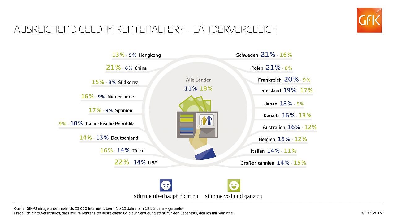 Das zeigen aktuelle Studienergebnisse von GfK. Die Umfrage fand im Sommer 2015 unter mehr als 23.000 Internetnutzern in 19 Ländern statt. Sie gibt Auskunft darüber, wie sehr die Befragten der Aussage zustimmen: „Ich bin zuversichtlich, dass ich ausreichend Geld für den Lebensstil haben werde, den ich mir wünsche, wenn ich in Rente gehe.“