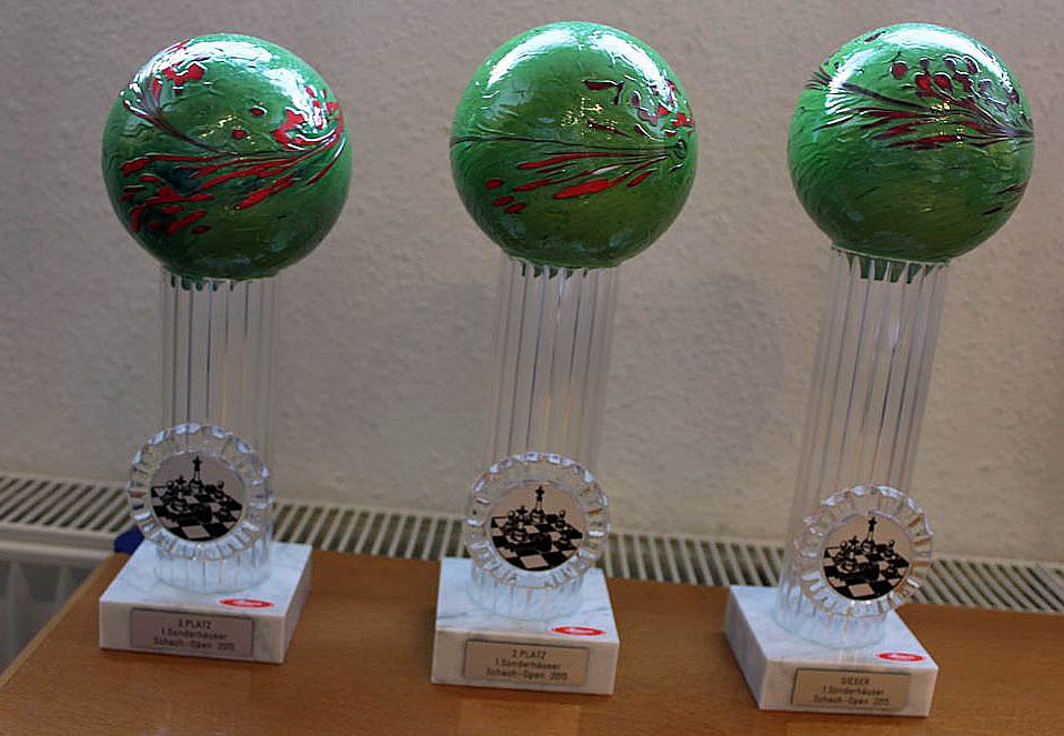 Um diese Pokale wird gespielt. Aber Götz Preuße hatte gleich noch weitere "Kröten" parat. Vom Förderverein Schach Thüringen e.V. werden nur noch drei Turniere ausgetragen und dann löst er sich zum 31.12.2015 auf. Was danach kommt ist noch nicht bekannt.