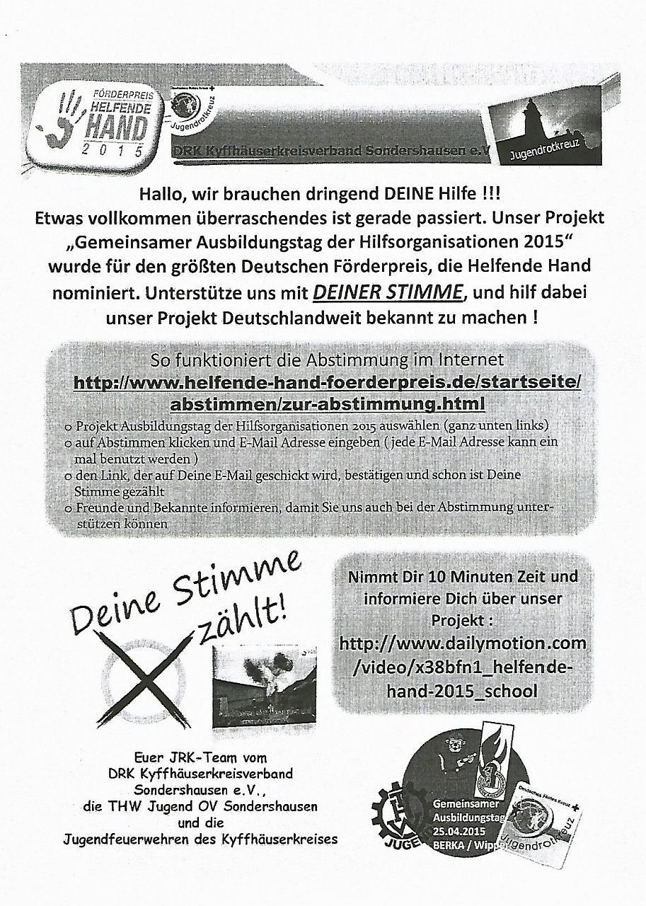 DRK Kyffhäuserkreis, THW Sondershausen und die Freiwilligen Feuerwehren der Stadt Sondershausen bewerben sich um den Publikumspreis im Wettbewerb Die helfende Hand