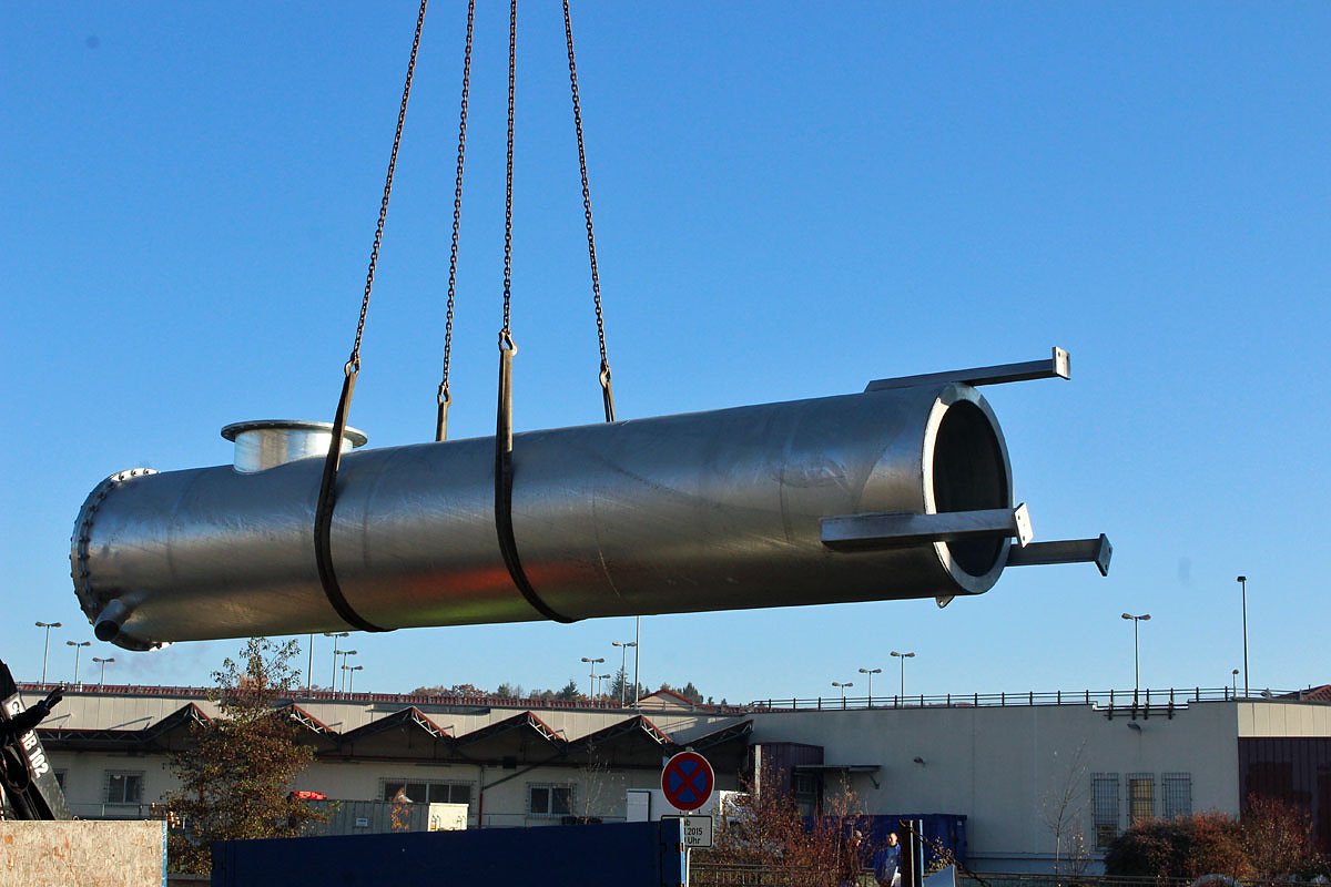 Hier noch waagerecht in der Luft hängend wird dieses Rohr von 1,20 m Durchmesser die Pumpe aufnehmen.