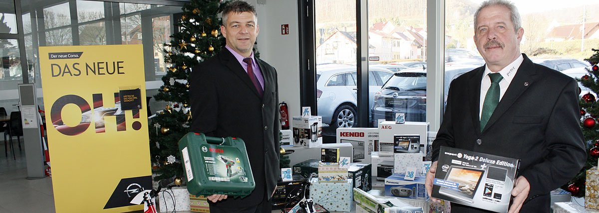 Was das Herz begehrt! Ob Flachbildfernseher oder Tablet, ob Rasenmäher oder Reisegutschein – Thomas Gensbügel und Klaus-Dieter Rothschuh spielen Weihnachtsmann. Foto: Fischer/Autohaus Peter