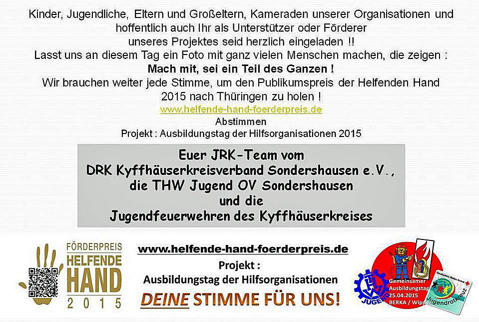 DRK Kyffhäuserkreis, THW Sondershausen und die Freiwilligen Feuerwehren der Stadt Sondershausen hatten im Frühjahr einen gemeinsamen Ausbildungstag. Dieser Ausbildungstag wurde als Projekt bei der Aktion die "Helfende Hand" eingereicht und für den Publikumspreis wird jede Stimme gebraucht.